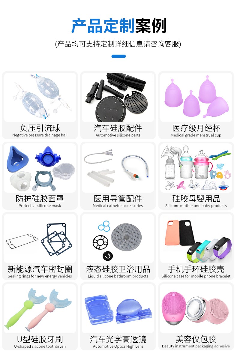 LSR液態(tài)硅膠注射成型高質(zhì)量制品,無色無毒無味,安全環(huán)保。液體硅膠具有優(yōu)異的透明度、抗撕裂強度、回彈性、抗黃變性、熱穩(wěn)定性、耐水、透氣性好、耐熱老化性和耐候性,同時粘度適中、便于操作,制品透明性高,可看到模具內(nèi)灌鑄材料是否有氣泡等缺陷,線收縮率≤0.1%,復(fù)制制品尺寸精密。我們的產(chǎn)品廣泛應(yīng)用于嬰幼兒用品、醫(yī)療用品、廚衛(wèi)烘焙、電子產(chǎn)品(密封件,按鍵)等等。